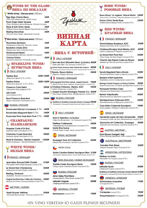 Ресторан Гранат - это винный бар. Здесь вы можете приятно провести время с друзьями или просто как следует отдохнуть после утомительного рабочего дня, а в этом вам с радостью помогут наши отменные бармены и наше меню - мы приготовили варианты горячительного, которые вам определённо понравятся! Вам нужно лишь рассказать, что предпочитаете: желаемый градус и вкус, состав или производителя. В нашей винной карте мы предлагаем большой выбор столовых и десертных вин из разных сортов винограда.